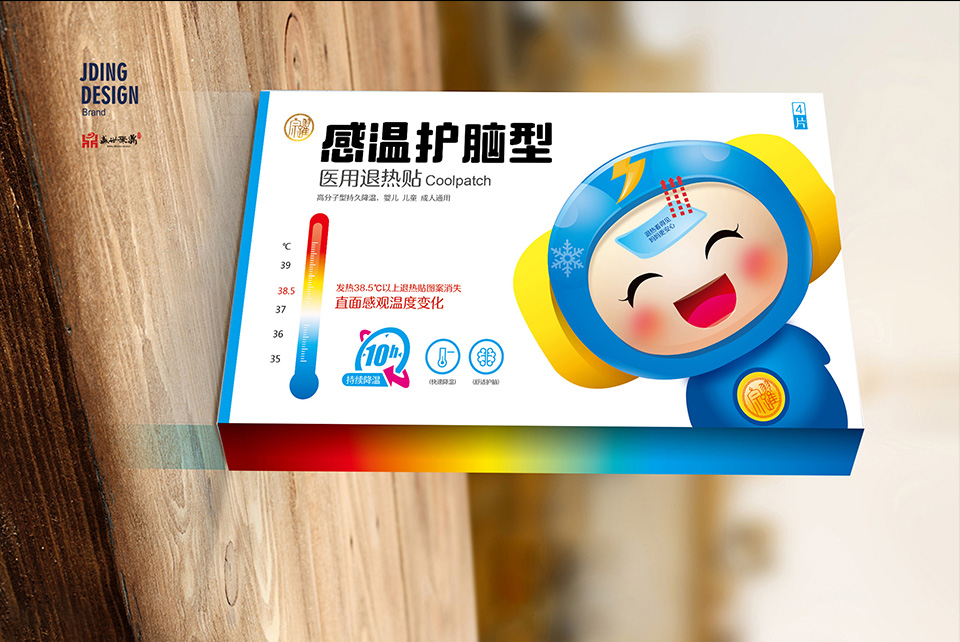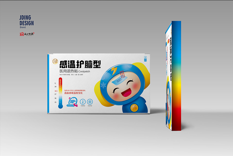 解决方案:聚鼎团队充分解决感温护脑退热贴包装设计专属性和独特性视觉设计包装,让宗躍退热贴能从诸多的各级别退热贴中脱颖而出!具有非常强的亲和力和视觉感官传达!从‘感温’产品特色的充分体现,和独特色彩定义,让产品有了特色专属!